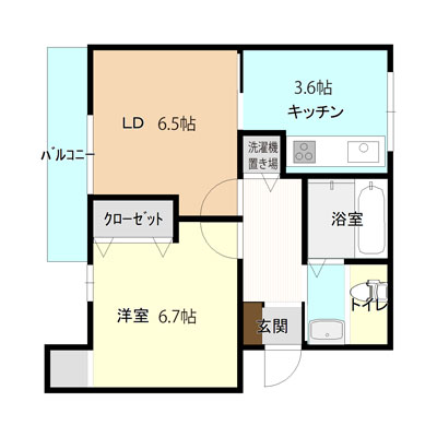 1LDK(LD6.5帖・K3.6帖・洋室6.7帖)