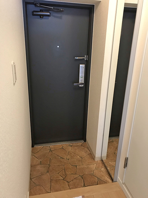 シューズボックス付きの玄関です。シューズボックスの扉は鏡になっています。