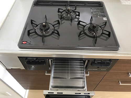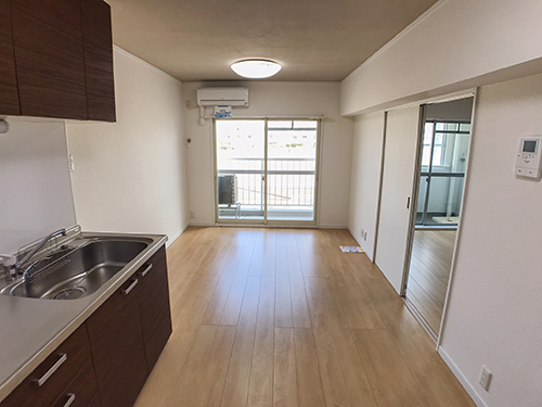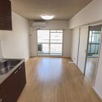 9.9帖のLDKです。ガスコンロのシステムキッチンです。エアコン付きです。